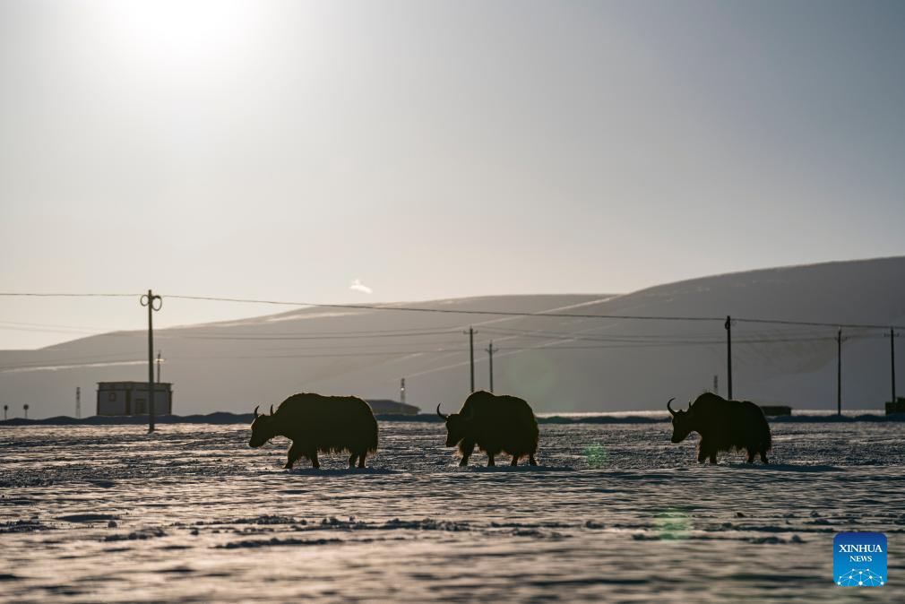 This photo taken on Nov. 5, 2023 shows yaks at a pasture in Damxung County, southwest China's Xizang Autonomous Region. (Xinhua/Sun Fei)