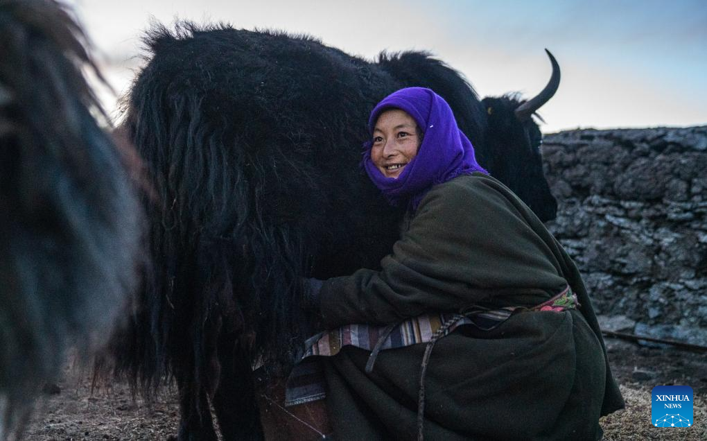 Yonten's wife milks a yak at a winter pasture in Dabug Village of Damxung County, southwest China's Xizang Autonomous Region, Nov. 10, 2023.(Photo by Tenzin Nyida/Xinhua)