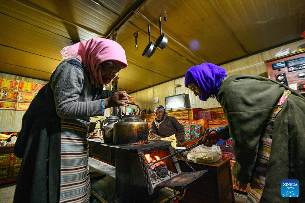 Yonten's wife (R) boils water at a winter pasture in Dabug Village of Damxung County, southwest China's Xizang Autonomous Region, Nov. 10, 2023. (Xinhua/Jigme Dorje)