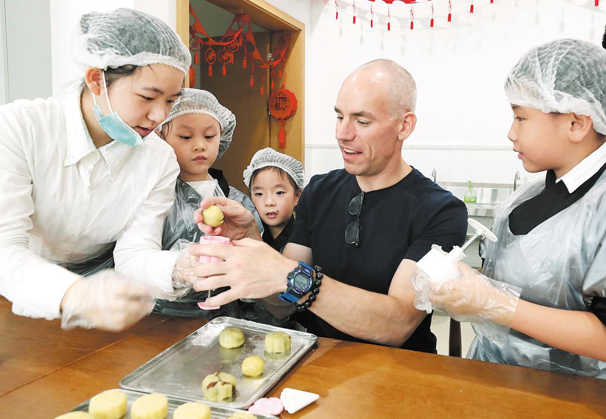 A US student who studies at Soochow University learn to make mooncakes with primary school children on Sept 15, 2020, in Suzhou, Jiangsu province.Hua Xuegen / for China Daily