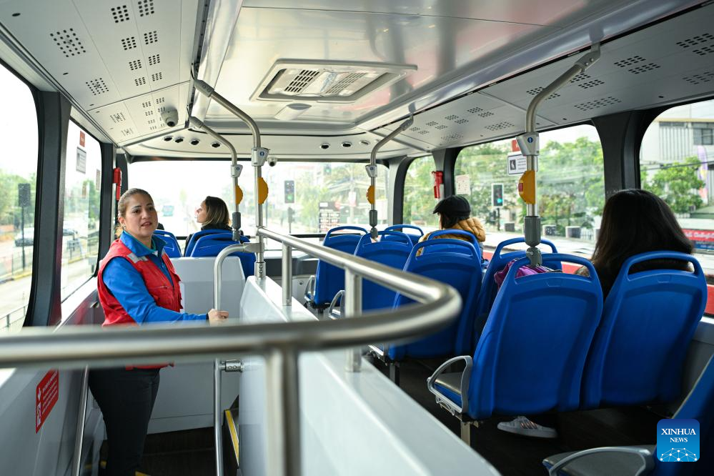 A staff member patrols inside an electric bus for the Pan American Games 2023 in Santiago, Chile, Nov. 2, 2023. (Xinhua/Xin Yuewei)