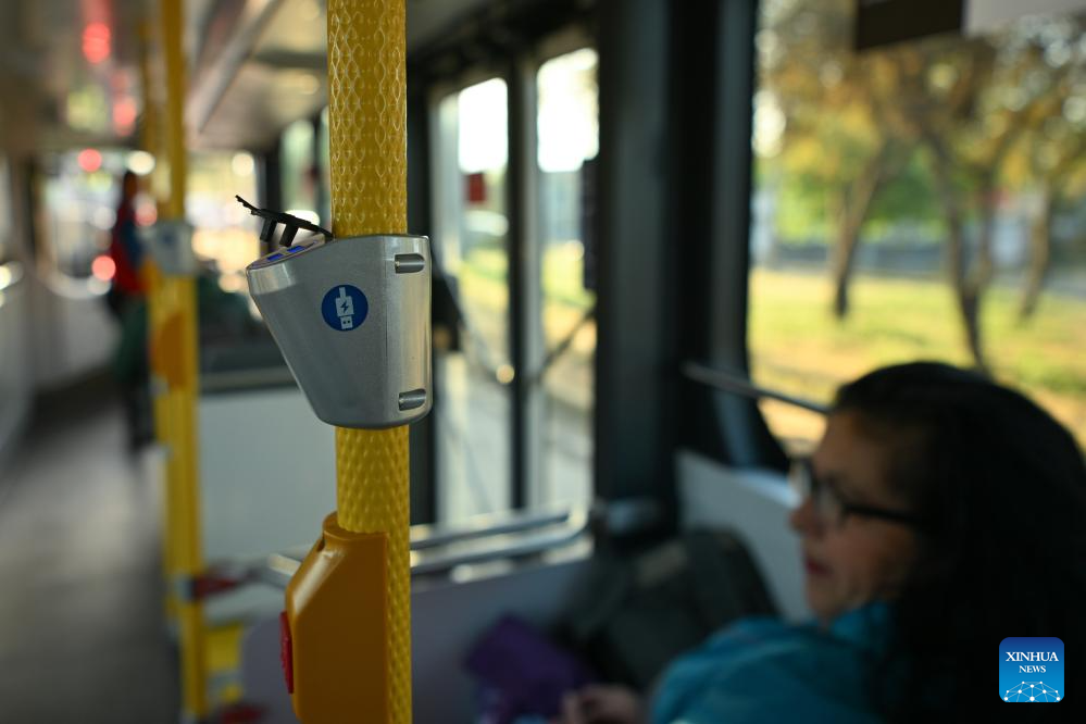 This photo taken on Nov. 2, 2023 shows a USB charging station inside an electric bus for the Pan American Games 2023 in Santiago, Chile. (Xinhua/Xin Yuewei)