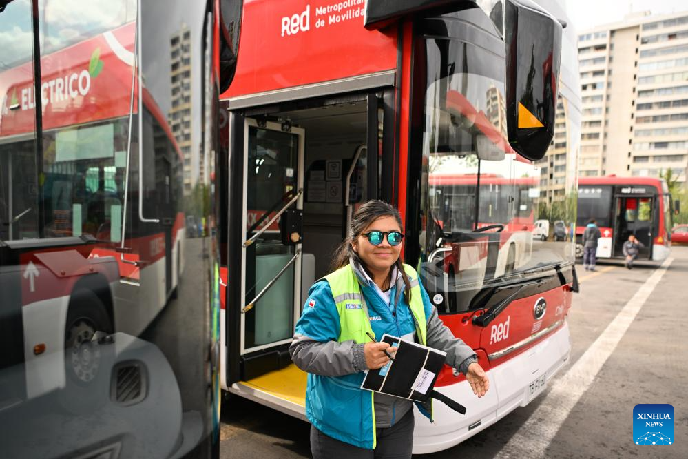 A driver is seen in front of an electric bus for the Pan American Games 2023 at a terminal in Santiago, Chile, Nov. 2, 2023. (Xinhua/Xin Yuewei)