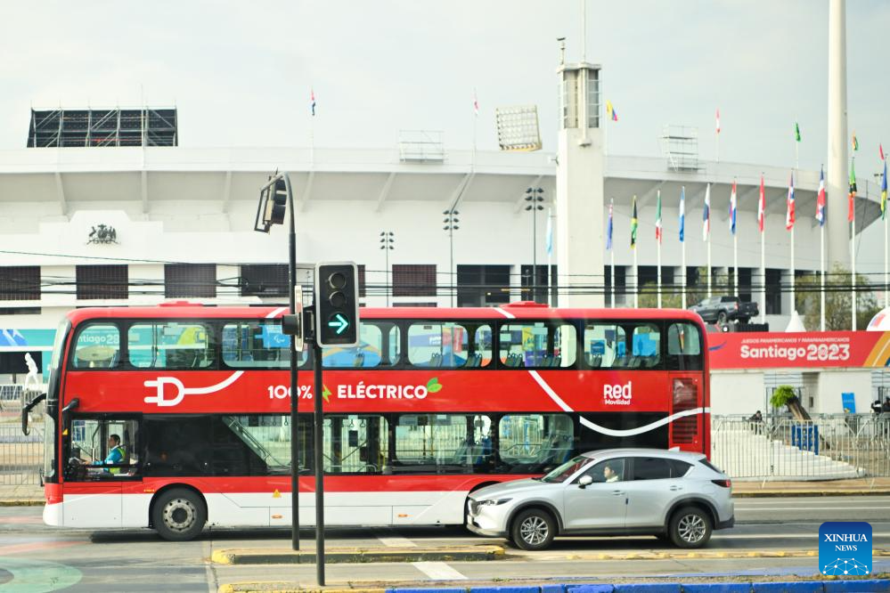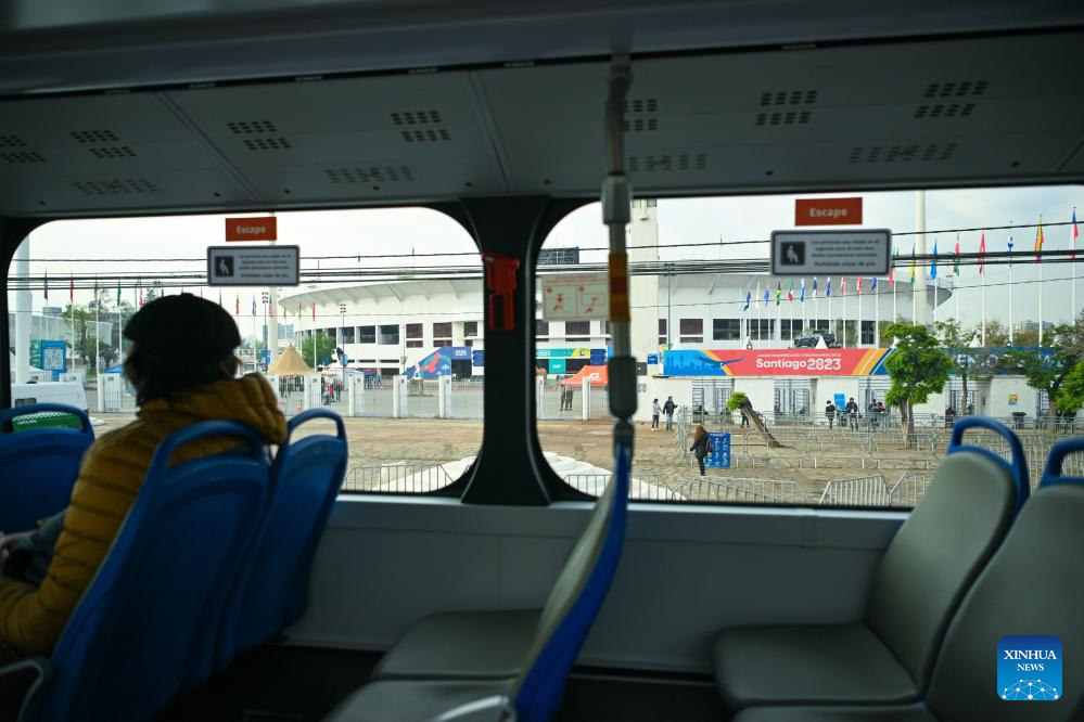 An electric bus for the Pan American Games 2023 runs past the National Stadium in Santiago, Chile, Nov. 2, 2023. (Xinhua/Xin Yuewei)
