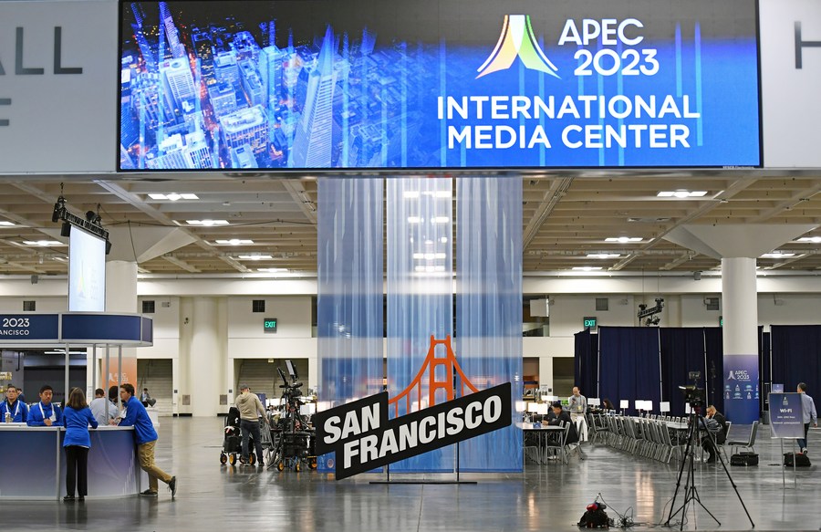 Journalists and staff members work at the international media center of APEC 2023 in San Francisco, the United States, on Nov. 12, 2023. This year's Asia-Pacific Economic Cooperation (APEC) Economic Leaders' Meeting will be held in San Francisco in the United States from Nov. 15 to 17. (Xinhua/Li Rui)