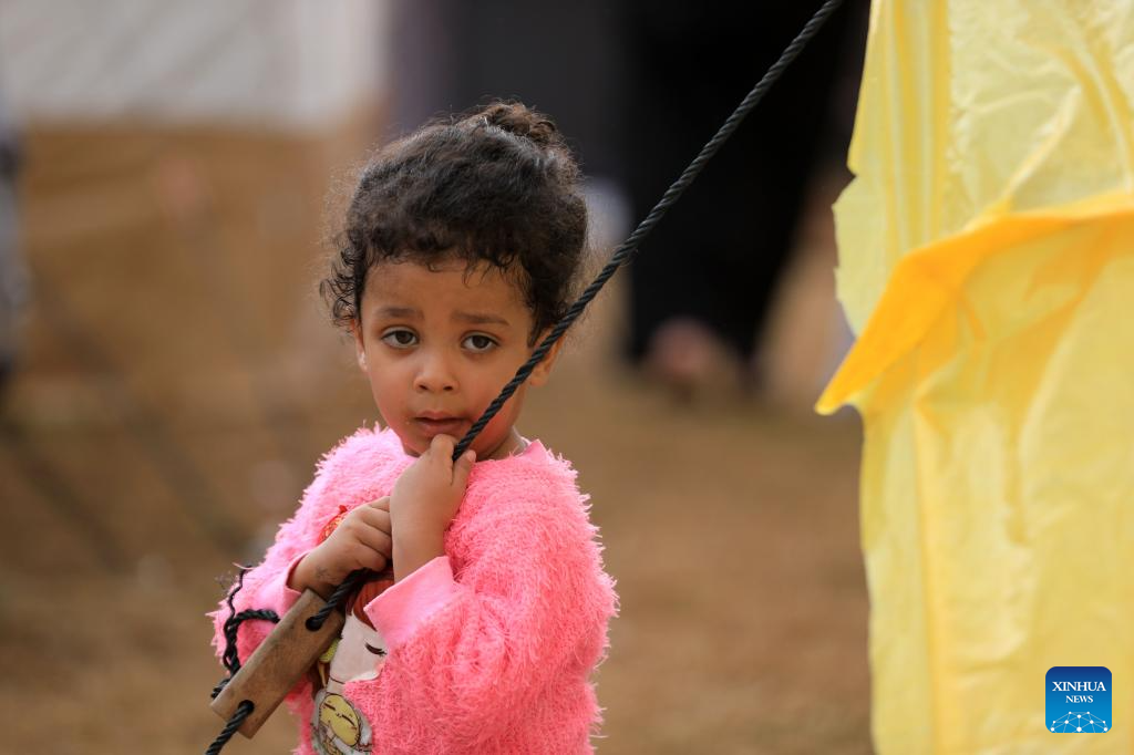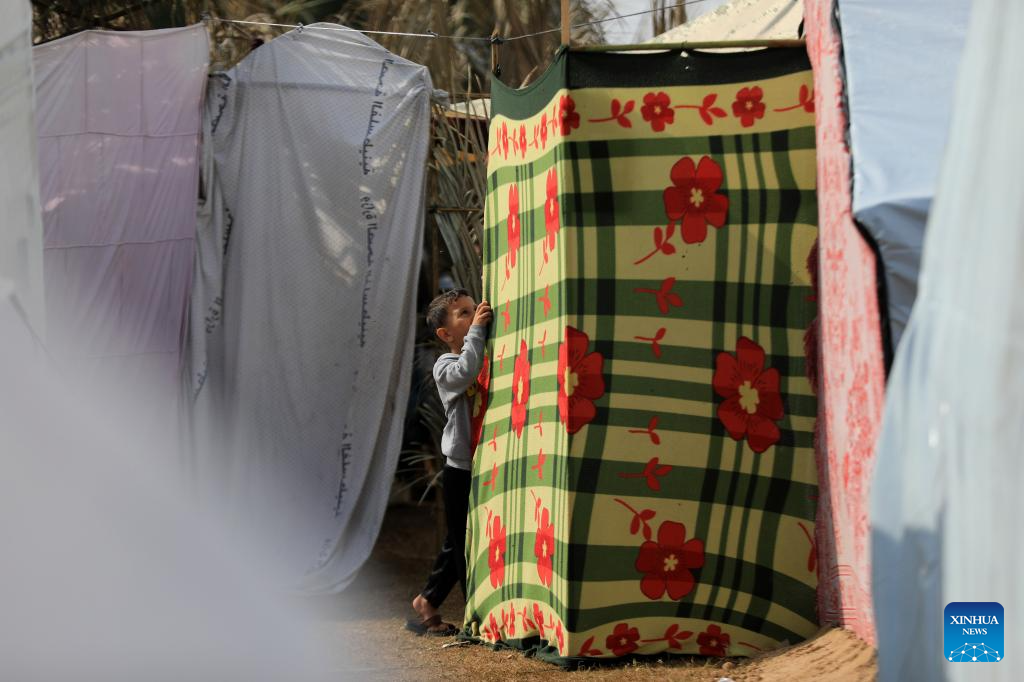 A displaced child is seen at a temporary shelter in the southern Gaza Strip city of Khan Younis, Nov. 14, 2023. (Photo by Yasser Qudih/Xinhua)