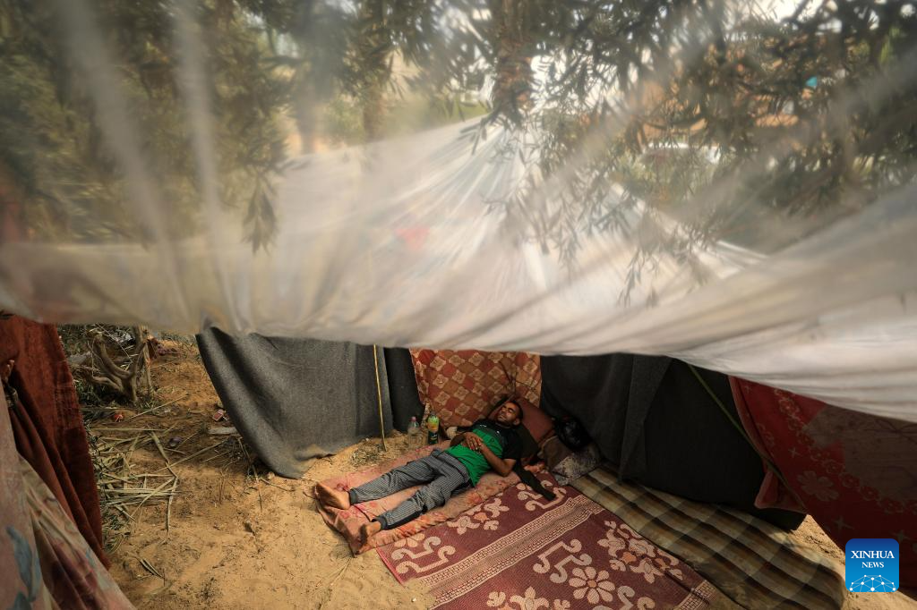 A displaced Palestinian man is seen at a temporary shelter in the southern Gaza Strip city of Khan Younis, Nov. 14, 2023. (Photo by Yasser Qudih/Xinhua)