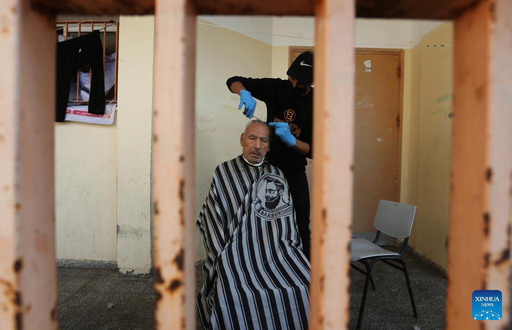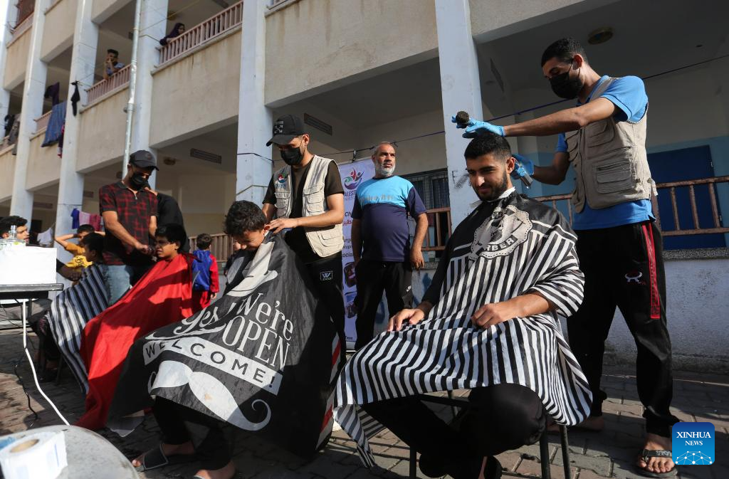 Volunteers give haircuts for people displaced in Hamas-Israel conflict, in the southern Gaza Strip city of Rafah, on Nov. 14, 2023. (Photo by Khaled Omar/Xinhua)