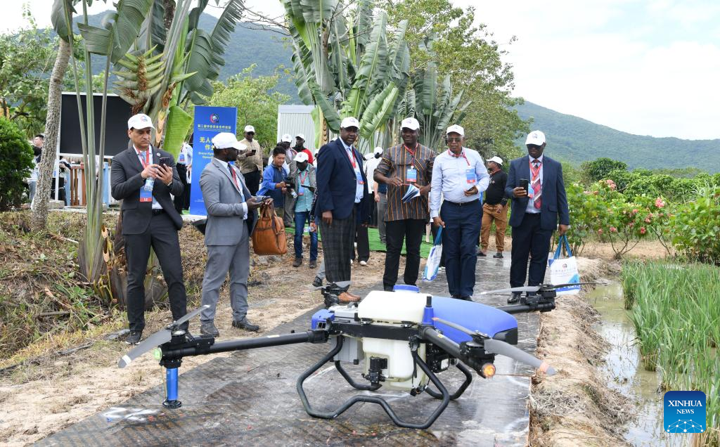Participants of the 2nd Forum on China-Africa Cooperation in Agriculture look at a drone at the Paddy Field National Park in Sanya, south China's Hainan Province, Nov. 14, 2023. The 2nd Forum on China-Africa Cooperation in Agriculture is held in Sanya from Monday to Wednesday. (Xinhua/Yang Guanyu)