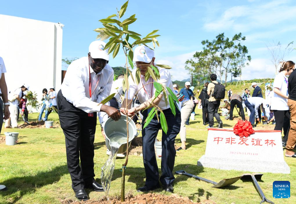 Participants of the 2nd Forum on China-Africa Cooperation in Agriculture plant trees while visiting local agricultural bases in Sanya, south China's Hainan Province, Nov. 14, 2023. The 2nd Forum on China-Africa Cooperation in Agriculture is held in Sanya from Monday to Wednesday. (Xinhua/Yang Guanyu)