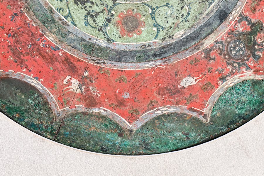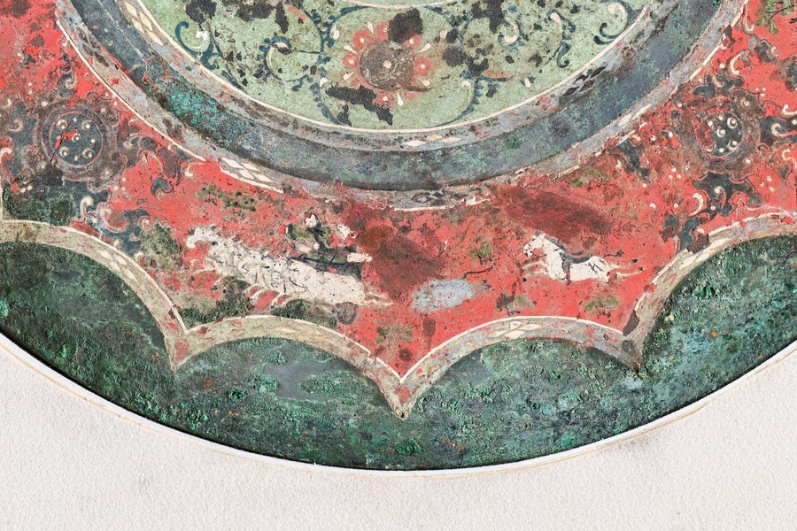 This photo taken on Aug. 25, 2023 shows part of a bronze mirror with colored patterns depicting a hunting event, collected at Xi'an Museum in Xi'an, northwest China's Shaanxi Province. (Xinhua/Li He)