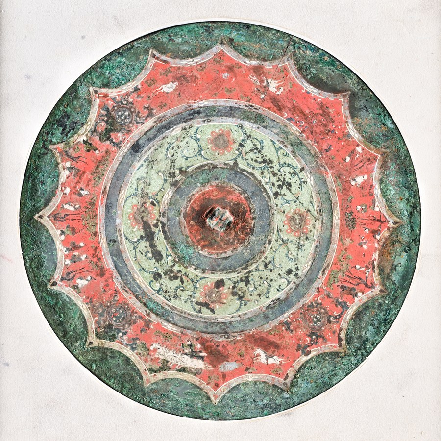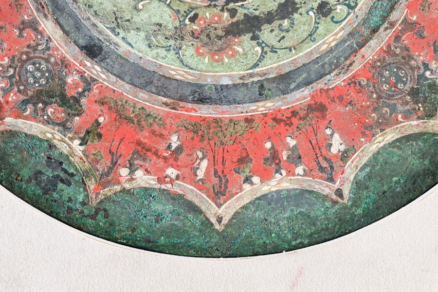 This photo taken on Aug. 25, 2023 shows part of a bronze mirror with colored patterns depicting an audience activity, collected at Xi'an Museum in Xi'an, northwest China's Shaanxi Province. (Xinhua/Li He)