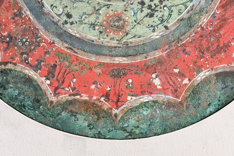 This photo taken on Aug. 25, 2023 shows part of a bronze mirror with colored patterns depicting a touring activity, collected at Xi'an Museum in Xi'an, northwest China's Shaanxi Province. (Xinhua/Li He)