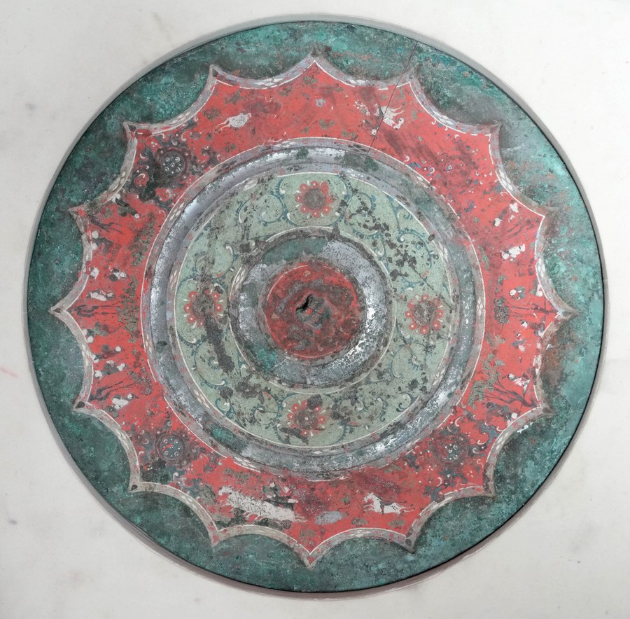 This photo taken on Aug. 25, 2023 shows a bronze mirror with colored patterns of figures, horses and carriages, collected at Xi'an Museum in Xi'an, northwest China's Shaanxi Province. (Xinhua/Li He)