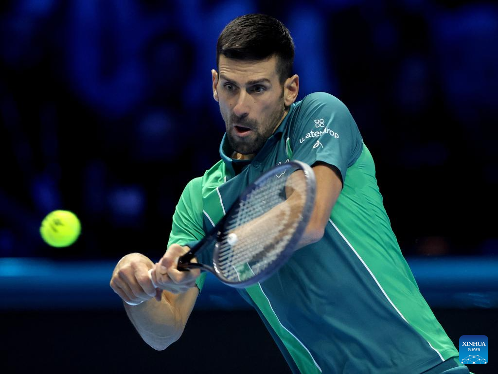 Novak Djokovic hits a return during the group stage match between Novak Djokovic of Serbia and Jannik Sinner of Italy at ATP Finals tennis tournament in Turin, Italy, Nov. 14, 2023. (Photo by Alberto Lingria/Xinhua)