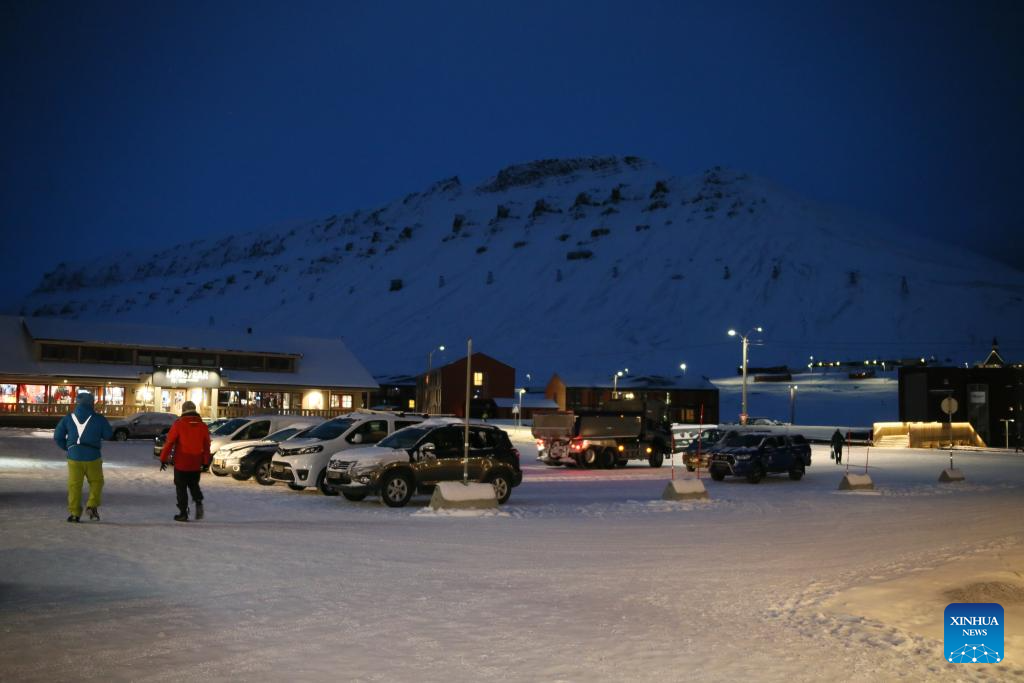 This photo taken on Nov. 14, 2023 shows a parking lot in Longyearbyen, Svalbard, Norway. Longyearbyen is situated within the Svalbard archipelago at a latitude of approximately 78 degrees north, about 1,300 kilometers from the North Pole, where a polar night lasting up to four months takes place each year. (Xinhua/Zhang Yuliang)