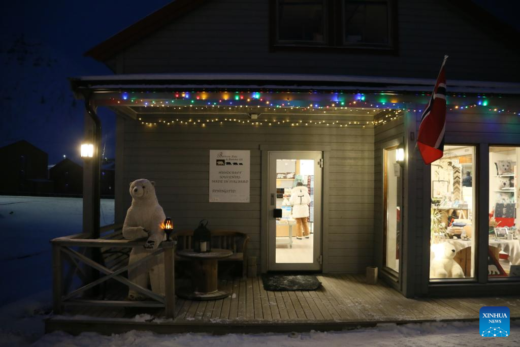 This photo taken on Nov. 14, 2023 shows a shop in Longyearbyen, Svalbard, Norway. Longyearbyen is situated within the Svalbard archipelago at a latitude of approximately 78 degrees north, about 1,300 kilometers from the North Pole, where a polar night lasting up to four months takes place each year. (Xinhua/Zhang Yuliang)