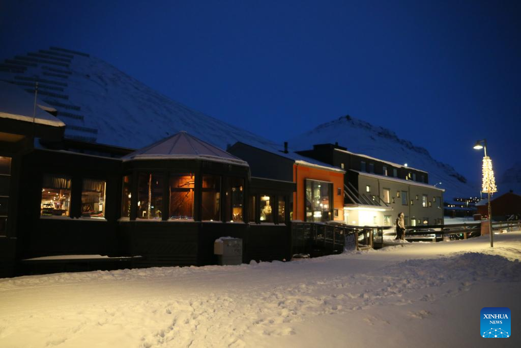 This photo taken on Nov. 14, 2023 shows a restaurant in Longyearbyen, Svalbard, Norway. Longyearbyen is situated within the Svalbard archipelago at a latitude of approximately 78 degrees north, about 1,300 kilometers from the North Pole, where a polar night lasting up to four months takes place each year. (Xinhua/Zhang Yuliang)
