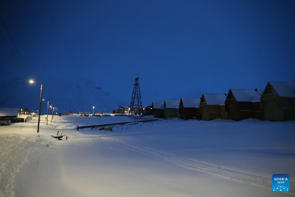 This photo taken on Nov. 14, 2023 shows a street in Longyearbyen, Svalbard, Norway. Longyearbyen is situated within the Svalbard archipelago at a latitude of approximately 78 degrees north, about 1,300 kilometers from the North Pole, where a polar night lasting up to four months takes place each year. (Xinhua/Zhang Yuliang)