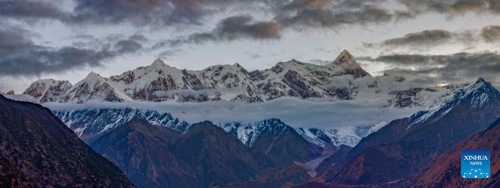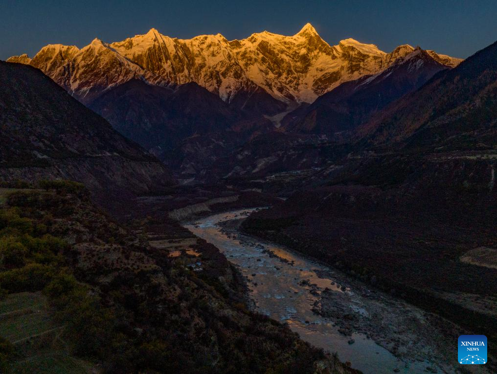 This photo taken on Nov. 13, 2023 shows the sunset scenery of Mount Namcha Barwa seen at Suosong Village of Nyingchi, southwest China's Tibet Autonomous Region. (Xinhua/Jiang Fan)