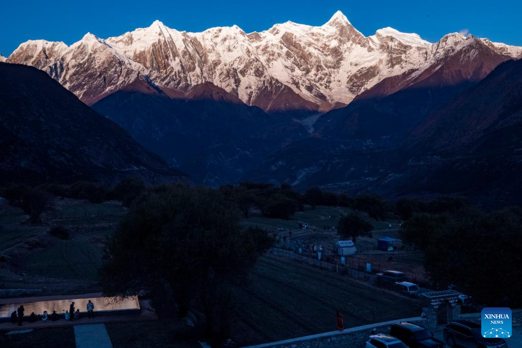 This photo taken on Nov. 13, 2023 shows the sunset scenery of Mount Namcha Barwa seen from the rooftop of a hotel in Suosong Village of Nyingchi, southwest China's Tibet Autonomous Region. (Xinhua/Jiang Fan)