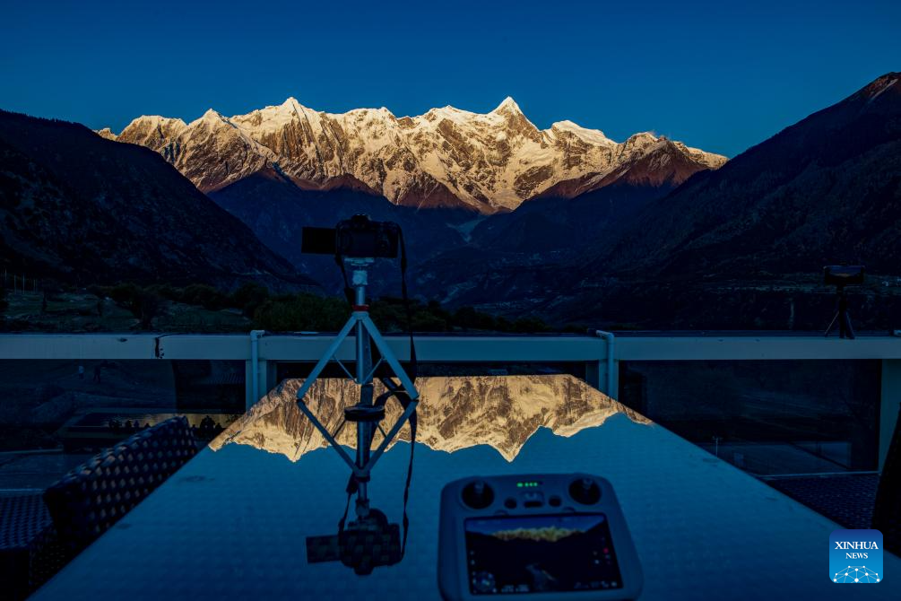 This aerial photo taken on Nov. 13, 2023 shows the reflection of a sunset scenery of Mount Namcha Barwa on a glass wall of a hotel in Suosong Village of Nyingchi, southwest China's Tibet Autonomous Region. (Xinhua/Jiang Fan)