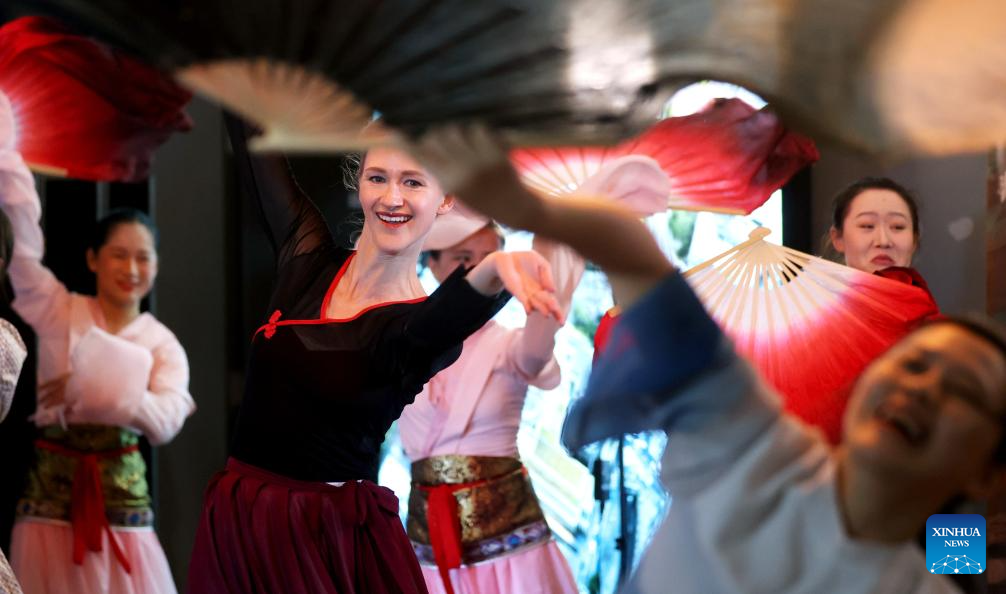 Anda Thomas from UK China Performing Arts learns Chinese dance at a Chinese dance workshop in London, Britain, Nov. 14, 2023. The closing ceremony of a Chinese dance workshop named "The Silk Road Connects You and Me" was held here on Tuesday. (Xinhua/Li Ying)