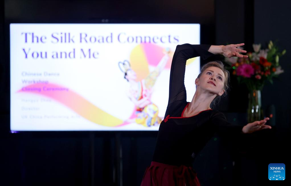 Anda Thomas from UK China Performing Arts dances during the closing ceremony of a Chinese dance workshop in London, Britain, Nov. 14, 2023. The closing ceremony of a Chinese dance workshop named "The Silk Road Connects You and Me" was held here on Tuesday. (Xinhua/Li Ying)