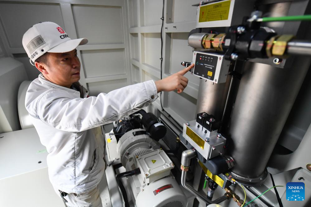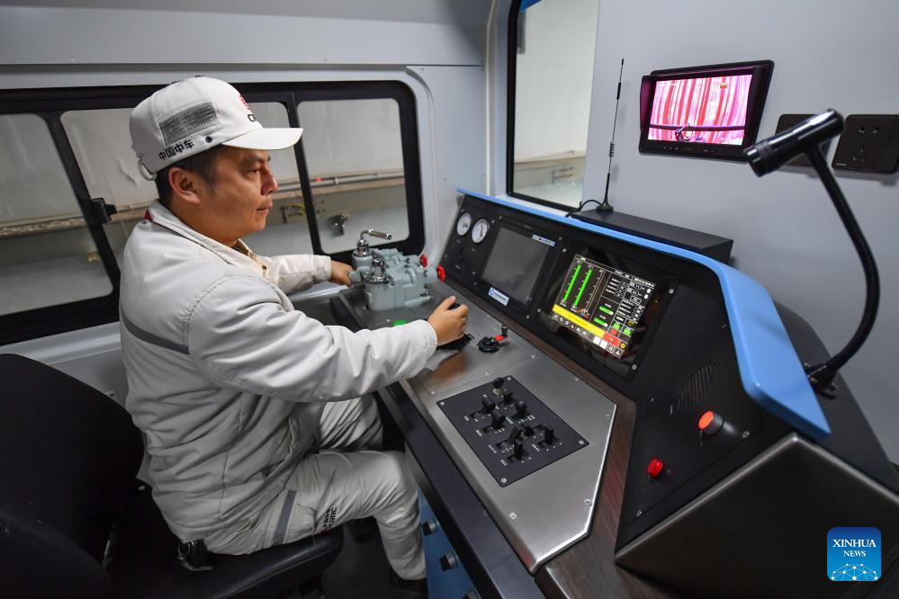 A staff member of CRRC Zhuzhou Locomotive Co., Ltd. performs a routine check inside a locomotive in Zhuzhou, central China's Hunan Province, Nov. 16, 2023. China's first newly-built high-power electric shunting locomotive rolled off the production line here on Thursday. With a maximum towing power of 1,500 kW, this locomotive is designed for industrial users in sectors such as metallurgy, harbor operation, electricity, petrochemical, and mining. (Xinhua/Chen Zeguo)