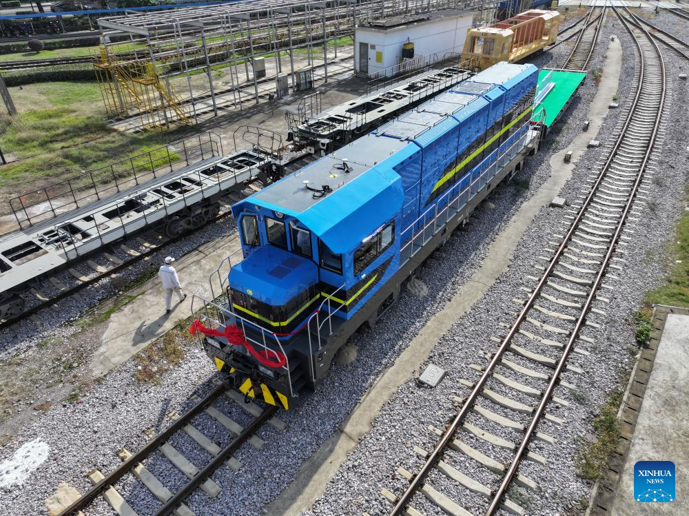 This aerial photo taken on Nov. 16, 2023 shows a locomotive at the CRRC Zhuzhou Locomotive Co., Ltd. in Zhuzhou, central China's Hunan Province. China's first newly-built high-power electric shunting locomotive rolled off the production line here on Thursday. With a maximum towing power of 1,500 kW, this locomotive is designed for industrial users in sectors such as metallurgy, harbor operation, electricity, petrochemical, and mining. (Xinhua/Chen Zeguo)
