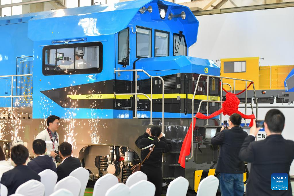 This photo taken on Nov. 16, 2023 shows the ceremony to mark the rolling off of China's first newly-built high-power electric shunting locomotive at CRRC Zhuzhou Locomotive Co., Ltd. in Zhuzhou, central China's Hunan Province. China's first newly-built high-power electric shunting locomotive rolled off the production line here on Thursday. With a maximum towing power of 1,500 kW, this locomotive is designed for industrial users in sectors such as metallurgy, harbor operation, electricity, petrochemical, and mining. (Xinhua/Chen Zeguo)