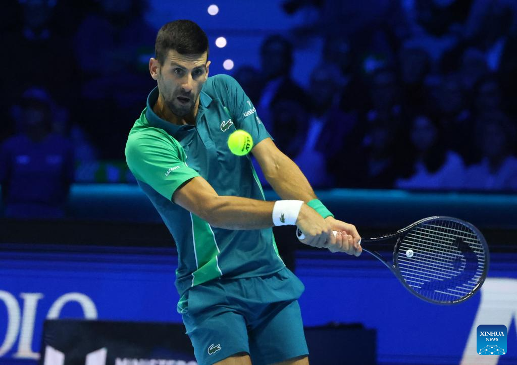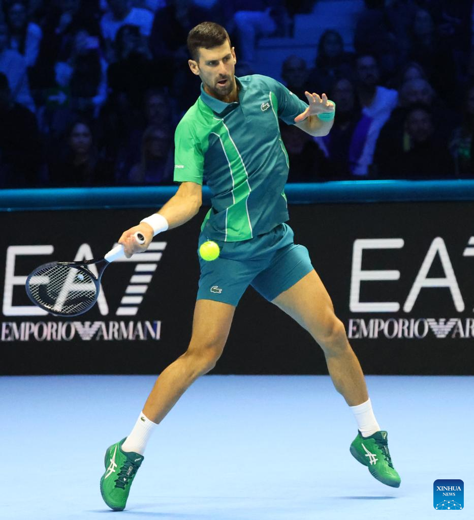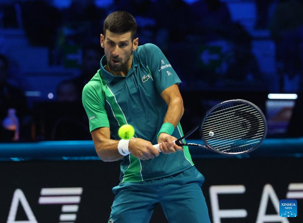 Novak Djokovic hits a return during the group stage match between Novak Djokovic of Serbia and Hubert Hurkacz of Poland at ATP Finals tennis tournament in Turin, Italy, Nov. 16, 2023. (Photo by Alberto Lingria/Xinhua)