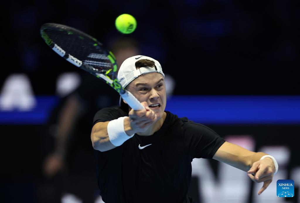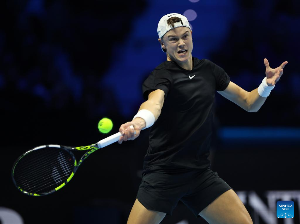 Holger Rune hits a return during the group stage match between Jannik Sinner of Italy and Holger Rune of Denmark at ATP Finals tennis tournament in Turin, Italy, Nov. 16, 2023. (Photo by Alberto Lingria/Xinhua)