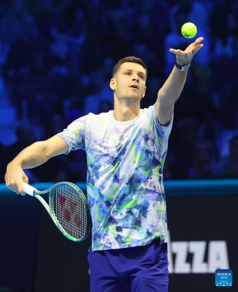 Hubert Hurkacz serves during the group stage match between Novak Djokovic of Serbia and Hubert Hurkacz of Poland at ATP Finals tennis tournament in Turin, Italy, Nov. 16, 2023. (Photo by Alberto Lingria/Xinhua)