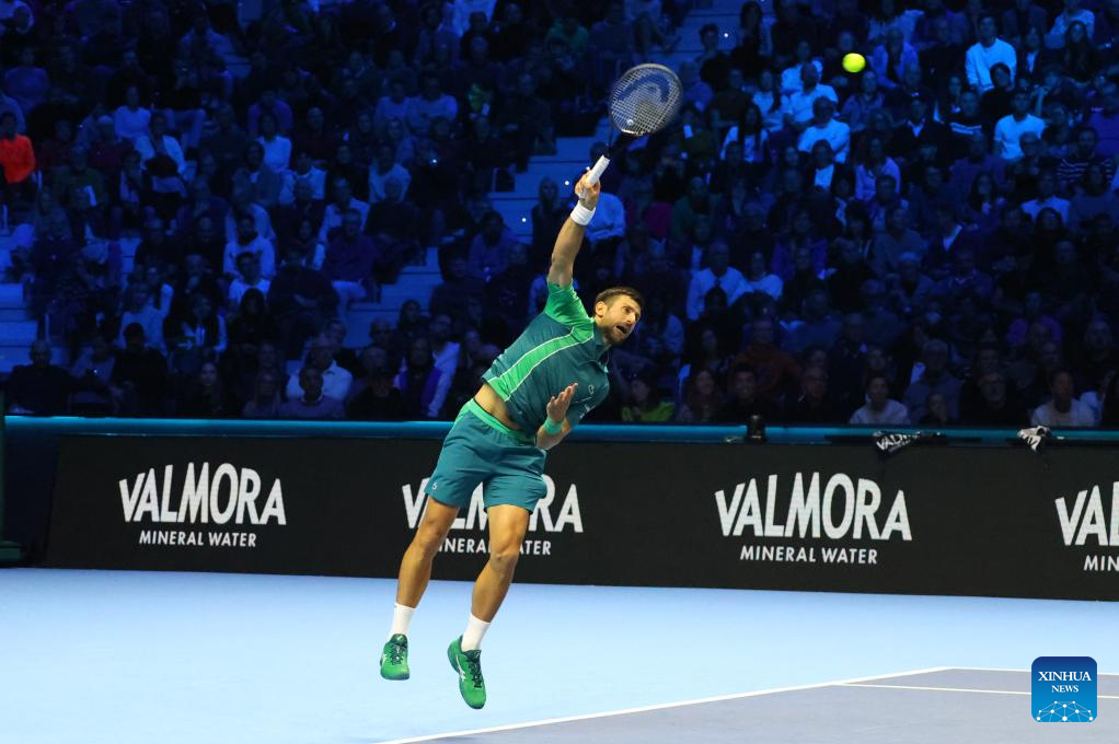 Novak Djokovic serves during the group stage match between Novak Djokovic of Serbia and Hubert Hurkacz of Poland at ATP Finals tennis tournament in Turin, Italy, Nov. 16, 2023. (Photo by Alberto Lingria/Xinhua)