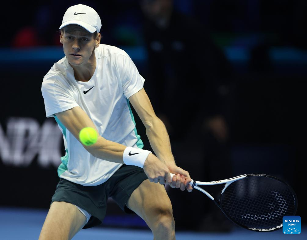 Jannik Sinner hits a return during the group stage match between Jannik Sinner of Italy and Holger Rune of Denmark at ATP Finals tennis tournament in Turin, Italy, Nov. 16, 2023. (Photo by Alberto Lingria/Xinhua)