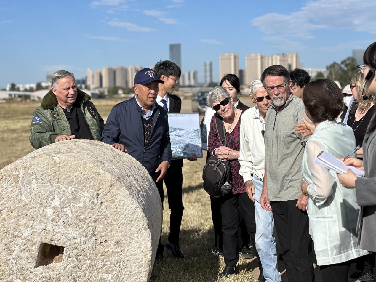 Members of a delegation of Flying Tigers veterans and their descendants listen to a docent telling the story behind a stone roller at the site of Chenggong Airport in Kunming, capital of southwest China's Yunnan province. Chenggong Airport was one of the main bases of the Flying Tigers in Kunming. During the construction of the airport, local people made tremendous efforts to level the runway with the stone roller. (People's Daily/Liu Lingling)
