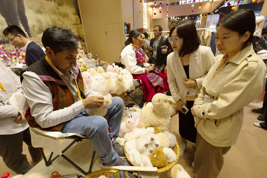Peruvian craftsman Oswaldo Mamani makes alpaca-fur stuffed toys at the booth of Warmpaca during the 6th China International Import Expo in east China's Shanghai, Nov. 7, 2023. (Xinhua/Gao Wei)