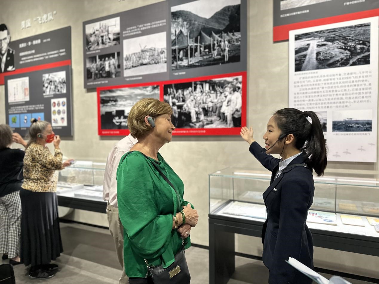 Nell Calloway listens to a guide telling Flying Tigers' stories in China in a museum in Liuzhou, south China's Guangxi Zhuang autonomous region. ?(People's Daily/Liu Lingling)