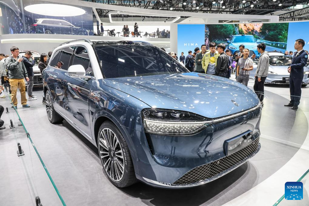 This photo taken on Nov. 17, 2023 shows an AITO M9 vehicle exhibited at the 21st Guangzhou International Automobile Exhibition in Guangzhou, south China's Guangdong Province. The latest achievements of intelligent driving were presented during the ongoing 21st Guangzhou International Automobile Exhibition. (Xinhua/Liu Dawei)