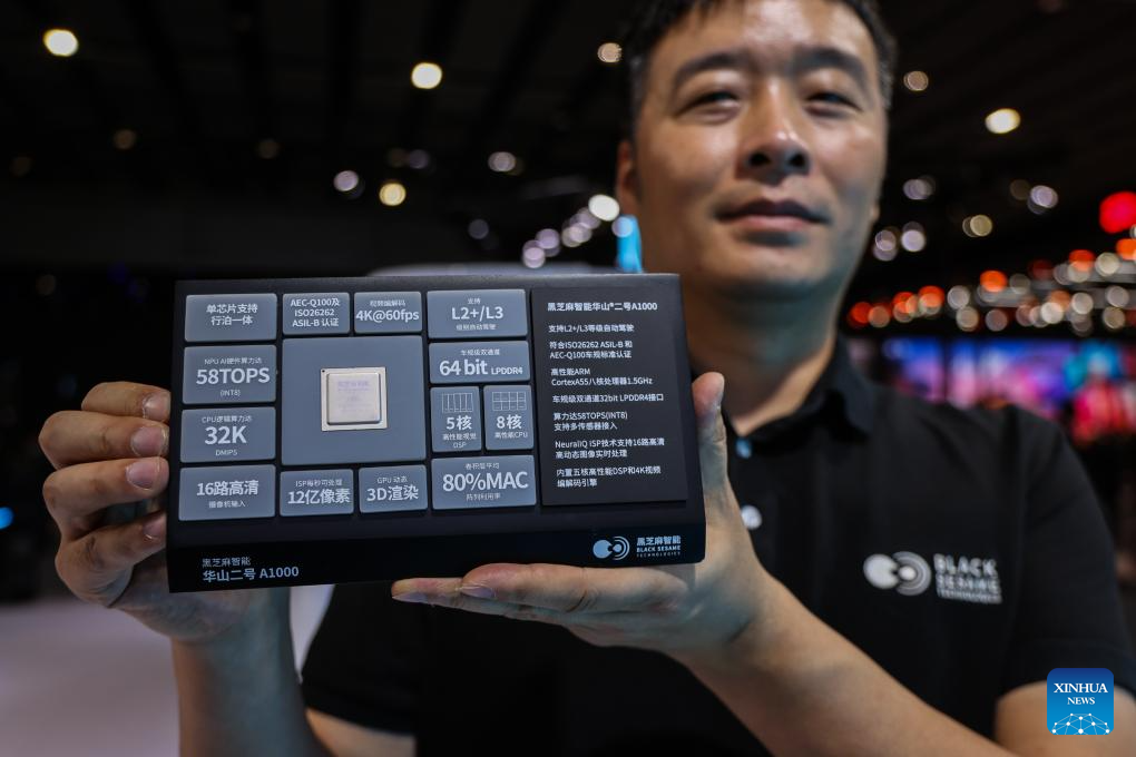 A staff member of Black Sesame Technologies shows a chip for self-driving vehicle at the 21st Guangzhou International Automobile Exhibition in Guangzhou, south China's Guangdong Province, Nov. 17, 2023. The latest achievements of intelligent driving were presented during the ongoing 21st Guangzhou International Automobile Exhibition. (Xinhua/Liu Dawei)