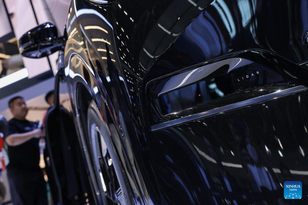 This photo taken on Nov. 17, 2023 shows a "LiDAR" label on a new energy vehicle at the 21st Guangzhou International Automobile Exhibition in Guangzhou, south China's Guangdong Province. The latest achievements of intelligent driving were presented during the ongoing 21st Guangzhou International Automobile Exhibition. (Xinhua/Liu Dawei)