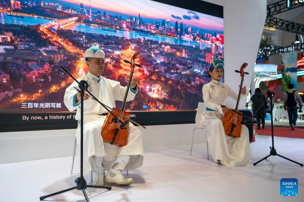 Performers play the horsehead fiddle at the exhibition zone of north China's Inner Mongolia Autonomous Region during the China International Travel Mart 2023 in Kunming, southwest China's Yunnan Province, Nov. 17, 2023. (Xinhua/Chen Xinbo)