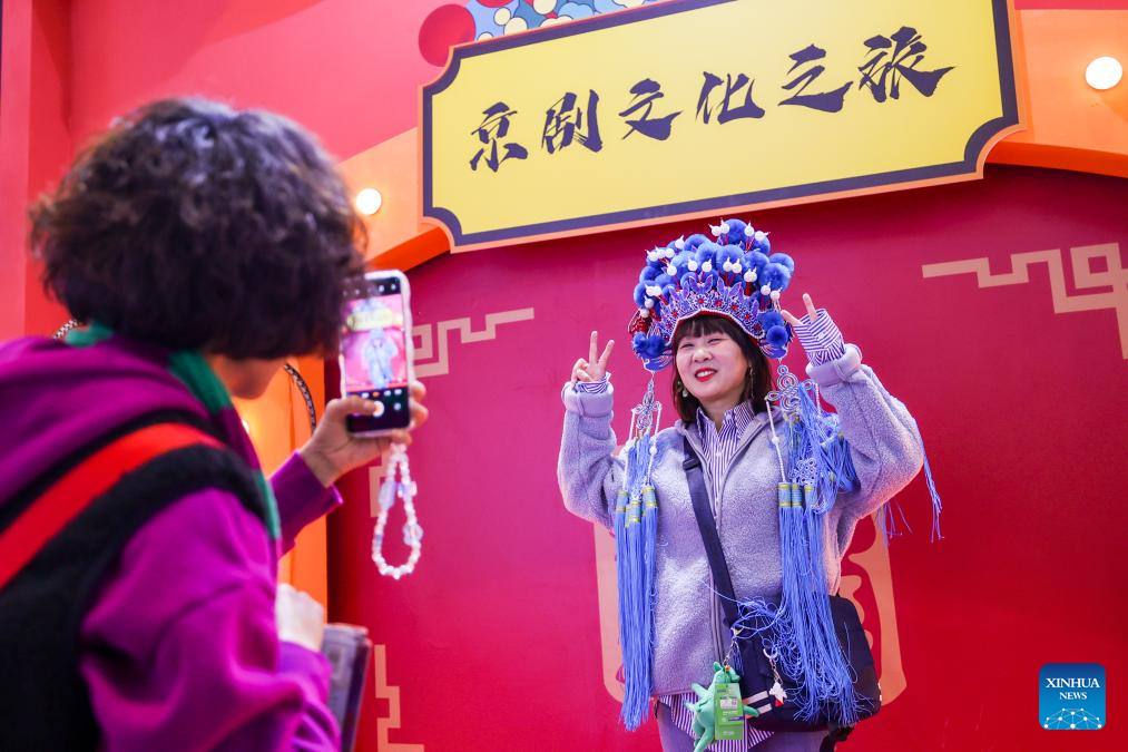 A visitor poses for a photo with headwear of Peking Opera at the exhibition zone of Beijing during the China International Travel Mart 2023 in Kunming, southwest China's Yunnan Province, Nov. 17, 2023. (Xinhua/Cui Wen)