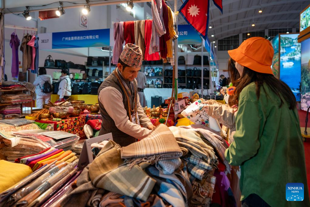 A Nepali exhibitor (L) sells scarves during the China International Travel Mart 2023 in Kunming, southwest China's Yunnan Province, Nov. 17, 2023. (Xinhua/Chen Xinbo)