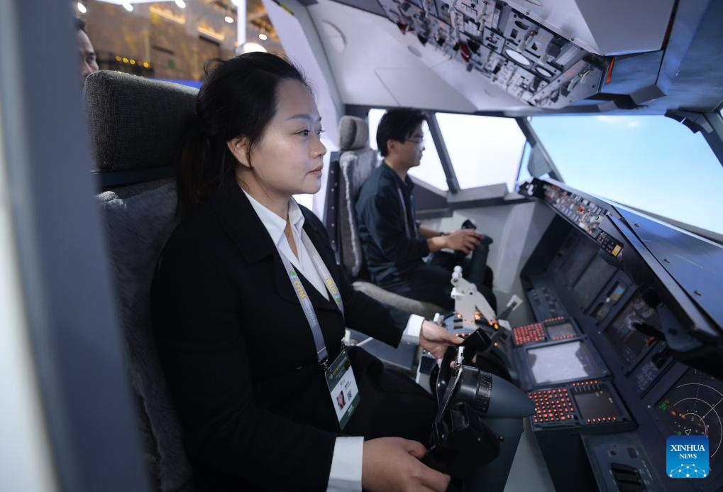 Visitors experience piloting simulation at the booth of Air China during the China International Travel Mart 2023 in Kunming, southwest China's Yunnan Province, Nov. 17, 2023. (Xinhua/Li He)