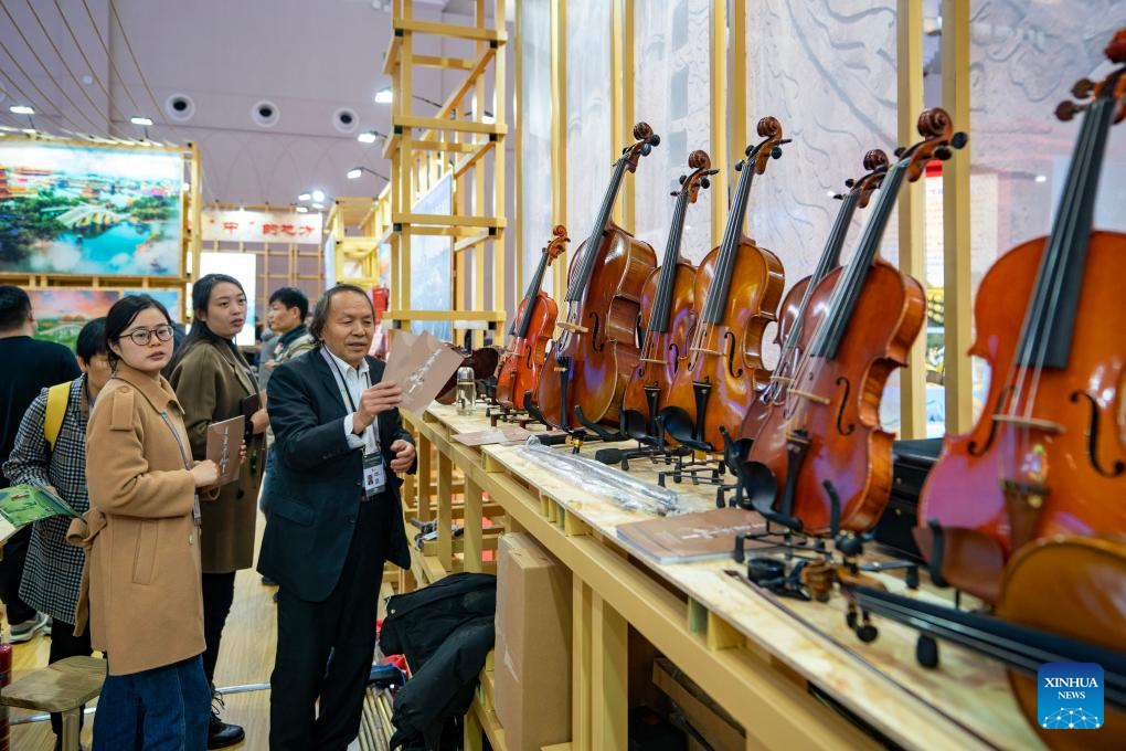 Visitors view violins exhibited during the China International Travel Mart 2023 in Kunming, southwest China's Yunnan Province, Nov. 17, 2023. (Xinhua/Chen Xinbo)