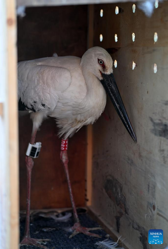 A rescued oriental white stork is pictured inside a wooden case at Qilihai Wetland in north China's Tianjin, Nov. 18, 2023. A total of 11 rescued oriental white storks and more than 100 other birds were released into the wild at Qilihai Wetland in north China's Tianjin on Saturday.