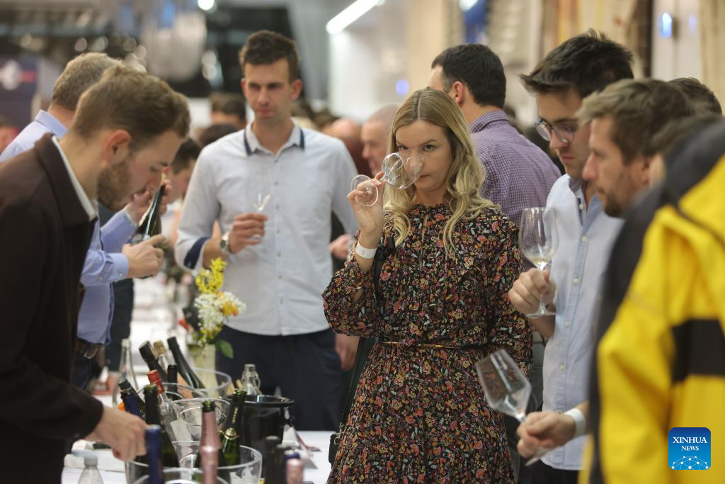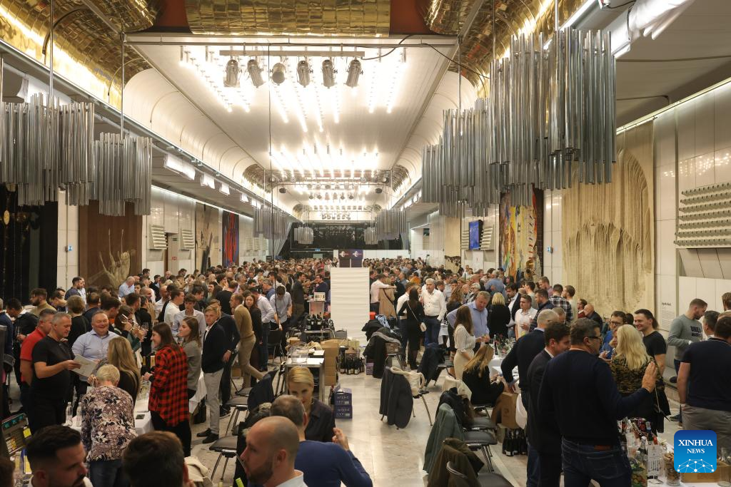 Visitors taste wines during the Slovenian Wine Festival at the Cankarjev Dom Centre in Ljubljana, Slovenia, on Nov. 17, 2023. (Photo by Zeljko Stevanic/Xinhua)