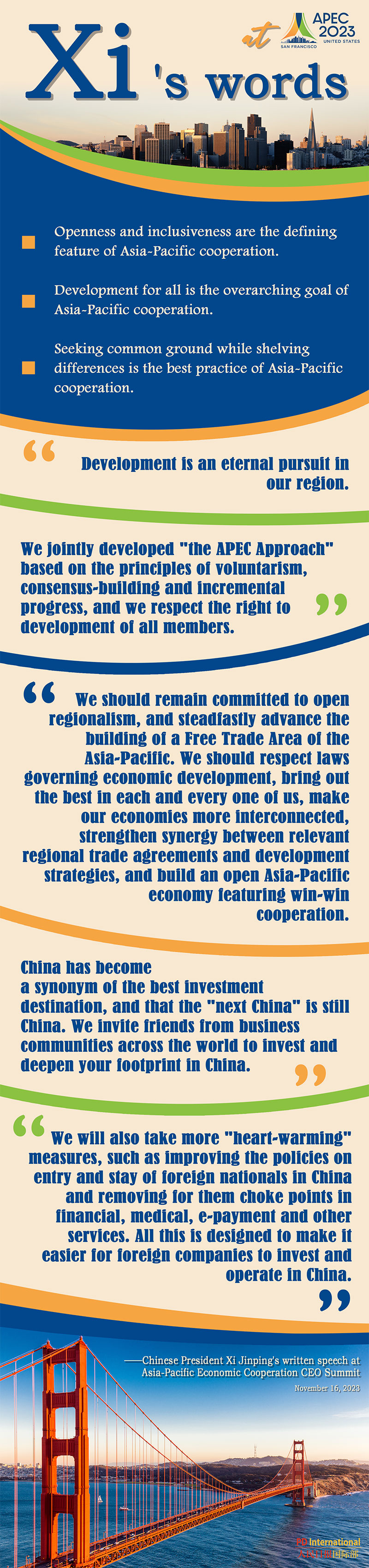 Chinese President Xi Jinping delivered a written speech at the Asia-Pacific Economic Cooperation (APEC) CEO Summit in San Francisco on Nov. 16, local time. He reviewed the remarkable journey of Asia-Pacific cooperation, summarized the historical experience of Asia-Pacific development, and answered a new question of the times-where will Asia-Pacific cooperation be headed in the next 30 years.